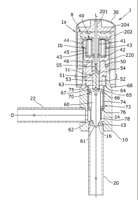本願は「弁装置」に関する発明を開示する。また、本願の図1は下図の通りである(本願より抜粋)。