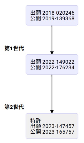 また、それぞれの出願の審査経過について、オリジナルの出願は1回目の拒絶理由通知に応答せずにそのまま拒絶査定で処分が確定しており、第1世代の出願は1回目の拒絶理由通知に対応して請求項を補正したが拒絶査定となって処分が確定しており、第2世代(今回)は1回目の拒絶理由通知に対応して請求項を補正して2回目の拒絶理由通知がきたが、2回目の拒絶理由通知には応答せずに拒絶査定で処分が確定している。